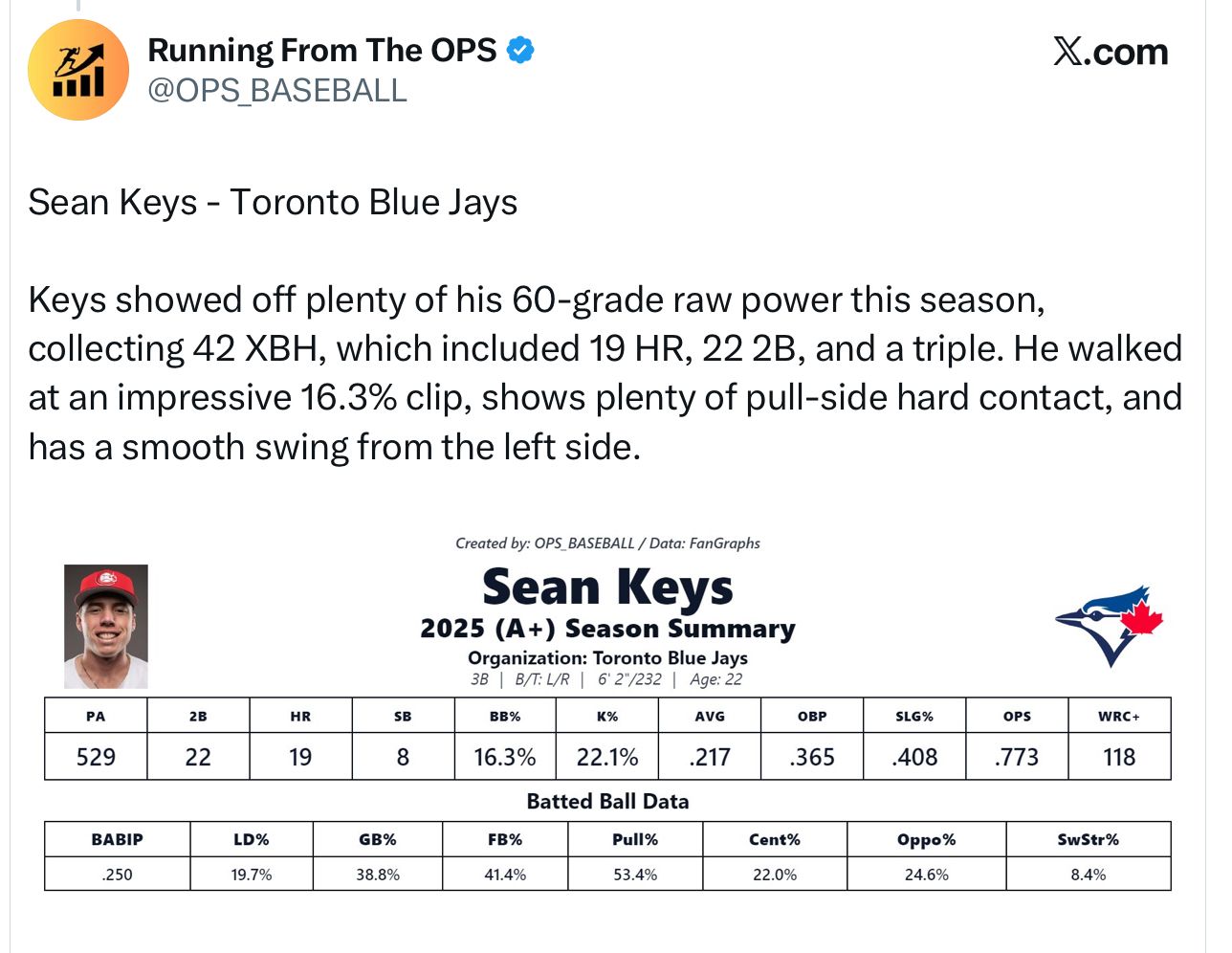 Keys had a strong (.873 OPS) second half, and set a Vancouver franchise single-season Home Run record with 19. Pipeline predicted a breakout season for him in 2025, and while that bust out didn’t happen, there’s still lots of upside here.